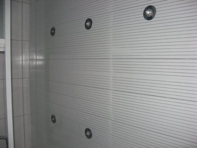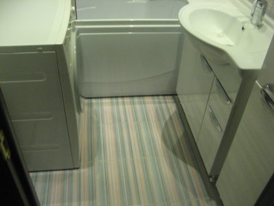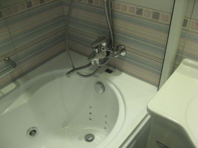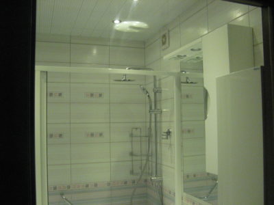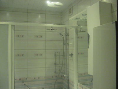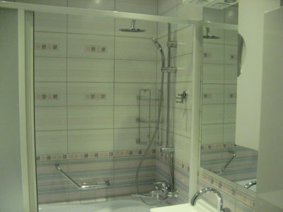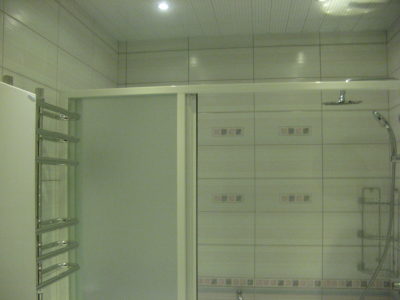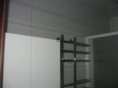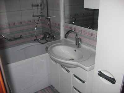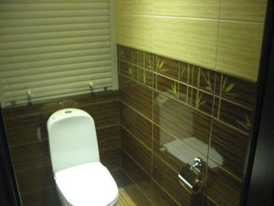 При ремонте раздельного санузла на улице Большая Лубянка наши мастера установили новые металлопластиковые трубы, заменили старую отделку, облицевали поверхности керамической плиткой и установили электрическую вытяжку. В ванной комнате смонтирована ванна с функцией джакузи, раздвижные стеклянные шторки, душ тропический ливень, мойдодыр с тройной тумбой и габаритный полотенцесушитель. В потолок вмонтированы точечные светильники в количестве 6 штук. Для облицовки использовался однотонный и украшенный декором кафель трендового бежевого оттенка с рифленой поверхностью. Узор напольной плитки имитирует классическую дорожку в полоску. В туалете уложена плитки в оливковых и коричневых тонах с рисунком. Общая стоимость ремонта составила 125000 рублей. На черновые материалы было выделено 33 тысячи руб.