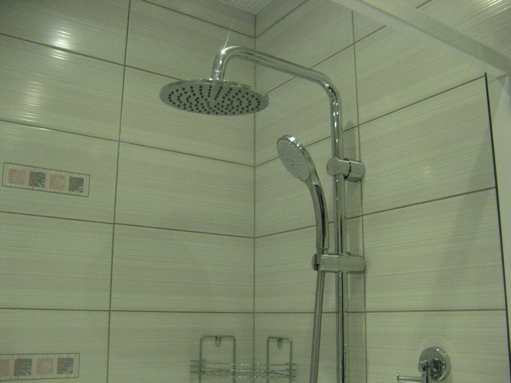 При ремонте раздельного санузла на улице Большая Лубянка наши мастера установили новые металлопластиковые трубы, заменили старую отделку, облицевали поверхности керамической плиткой и установили электрическую вытяжку. В ванной комнате смонтирована ванна с функцией джакузи, раздвижные стеклянные шторки, душ тропический ливень, мойдодыр с тройной тумбой и габаритный полотенцесушитель. В потолок вмонтированы точечные светильники в количестве 6 штук. Для облицовки использовался однотонный и украшенный декором кафель трендового бежевого оттенка с рифленой поверхностью. Узор напольной плитки имитирует классическую дорожку в полоску. В туалете уложена плитки в оливковых и коричневых тонах с рисунком. Общая стоимость ремонта составила 125000 рублей. На черновые материалы было выделено 33 тысячи руб.
