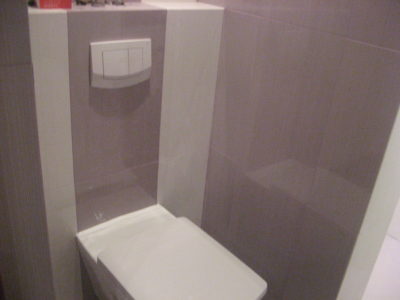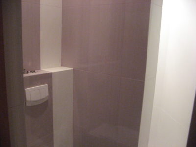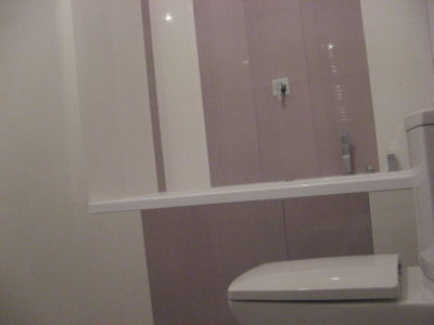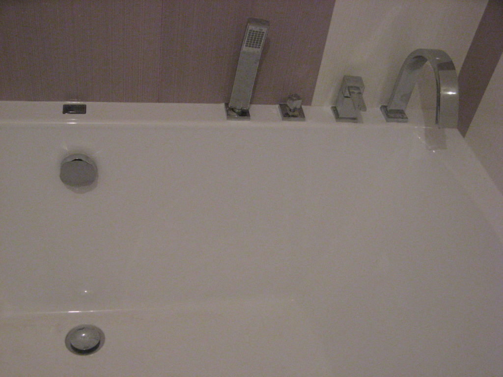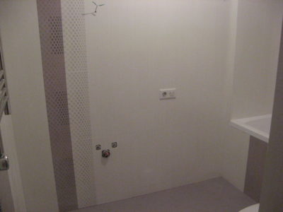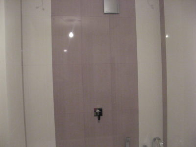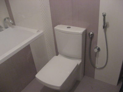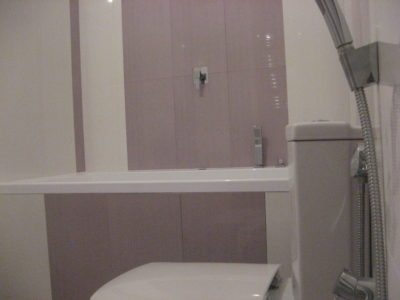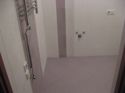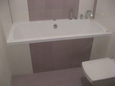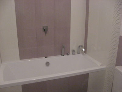 При ремонте раздельного санузла на улице Вавилова мастера полностью демонтировали отделку вплоть до бетона и разобрали старый трубопровод. После укладки стяжки, выравнивания поверхностей и монтажа коммуникаций мы установили на потолок подвесную конструкцию со встроенными светильниками, а пол и стены облицевали крупноформатной керамической плиткой в трендовом бежевом цвете. Прямоугольная ванна занимает всю нишу вдоль глухой стены. Изюминки интерьера: облицованный в тон общей композиции экран, отсутствие привычного умывальника и монтаж крана прямо на торцевой части ванны. В помещении также установлены подвесной унитаз с душем биде и электрический полотенцесушитель. Цена ремонт – 124 тыс. руб. Черновые материалы – 33000 р.