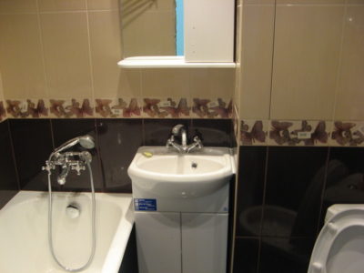 Мы установили унитаз, акриловую ванну с гибким душем, рукомойник со шкафом и зеркалом, а также смонтировали держатели для туалетной бумаги и полотенец. Проведена новая электропроводка и выполнен монтаж электрического полотенцесушителя. Подвесной потолок оформлен пластиковыми панелями со встроенными светильниками. Смета ремонта — 108000 р. Черновые материалы — 36 тыс. руб.