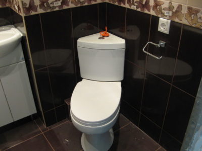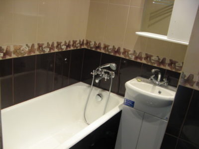 Наша компания выполнила ремонт санузла на Рязанском проспекте. Изюминкой интерьера стало оформление дизайна неординарным орнаментом. Декоративные плитки и фреза с изображением золотых бабочек перемежаются с однотонным кафелем бежевого и темно-коричневого цветов. За счет контраста удалось визуально расширить пространство.