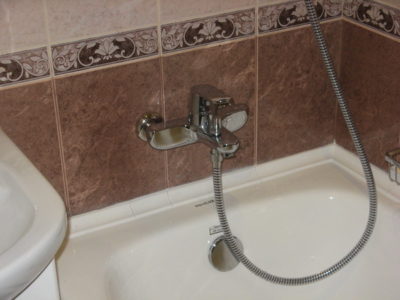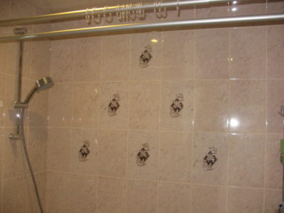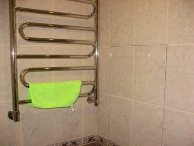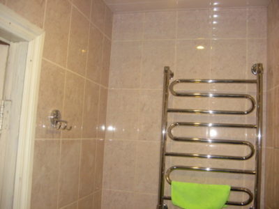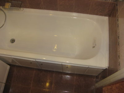 Наша компания выполнила ремонт совмещенного санузла на улице Краснобогатырской. В ходе проведения демонтажных и ремонтно-отделочных работ были полностью заменены отделка поверхностей и установлена новая сантехника (акриловая ванна, мойдодыр, унитаз и электрический полотенцесушитель). Для облицовки стен использовалась бежевая и коричневая керамическая плитка. На пол уложен темный кафель в тон общему интерьеру. Защитный экран под ванной выполнен в виде распашных дверок. Потолок оформлен пластиковыми панелями. Над дверью смонтировано боковое бра. Смета на ремонт — 125000 рублей. Стоимость черновых материалов — 40 тыс. руб.