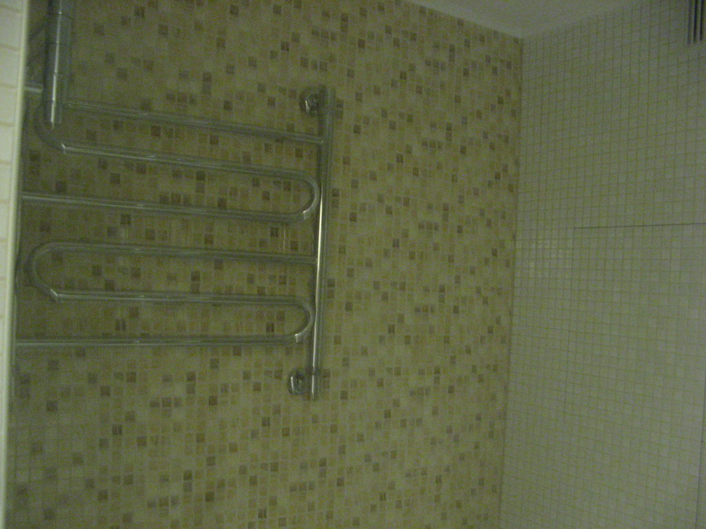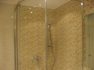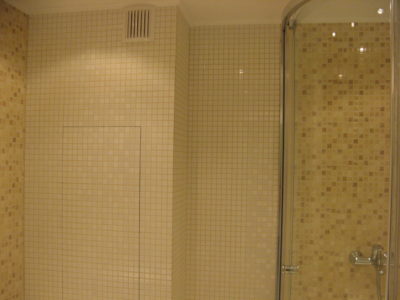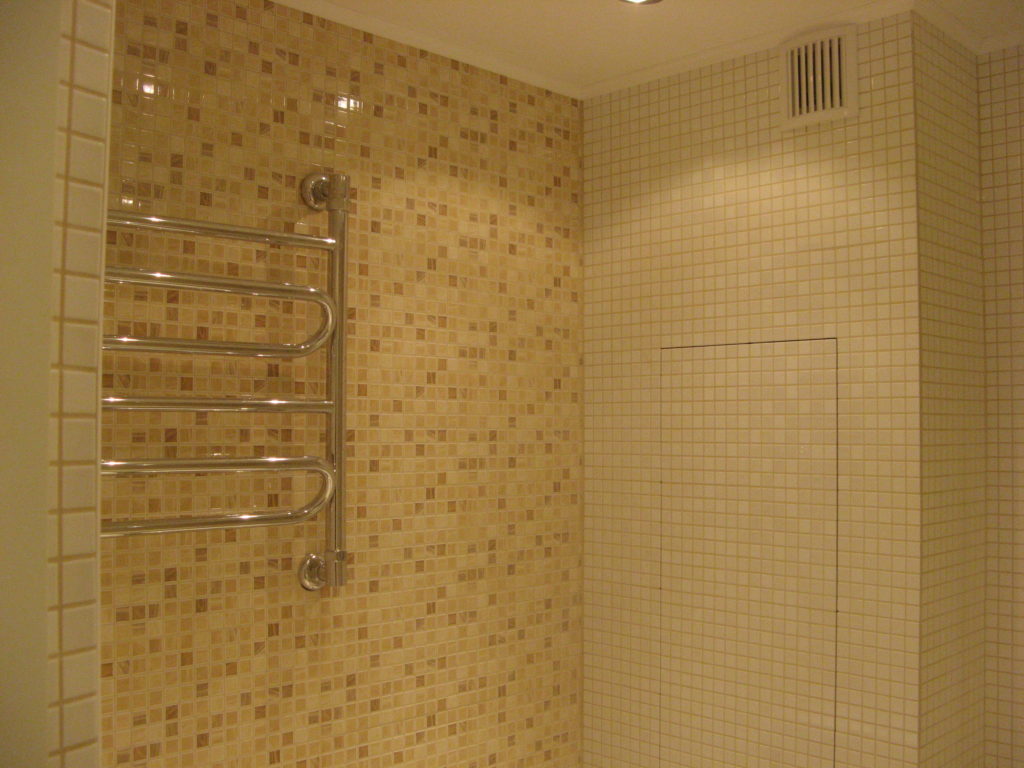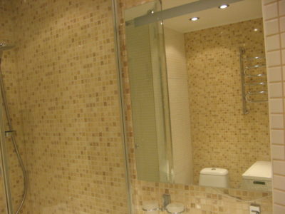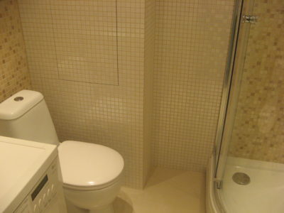 Наша компания выполнила капитальный ремонт совмещенного с ванной комнатой санузла на улице Новочеремушкинская. Для декорирования поверхностей дизайнер выбрала мозаичную плитку двух видов: однотонную и цветную. Благодаря правильно подобранному расположению сантехники малогабаритное помещение выглядит просторным, а за счет теплых оттенков плитки – уютным. В санузле мастера установили полукруглую душевую кабину со стеклянными дверцами и рукомойник с тумбой с правой стороны от входа, а компактный унитаз, полотенцесушитель и стиральную машину – с левой. В подвесной потолок вмонтированы точечные светильники, а на пол уложен кафель светло-бежевого цвета. Цена ремонта – 126 тысячи рублей. Стоимость черновых материалов – 32 тыс. руб