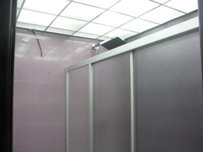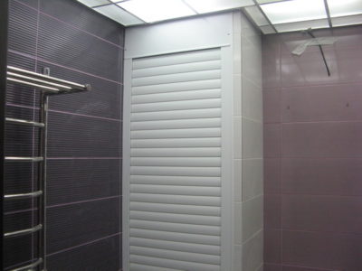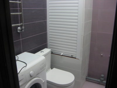 В санузле установлены ванна с защитными стеклянными шторками и гибким душем, унитаз, полотенцесушитель и стиральная машина. Потолок оформлен металлическим профилем с прозрачными панелями. Смета по ремонту составила 121 тысячу рублей. Стоимость черновых материалов — 30 тыс. 200 руб.