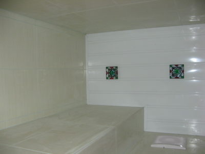 Наша компания выполнила ремонт туалета на улице Юных ленинцев. Мы отошли от принципов классического оформления стен в два цвета и облицевали боковые поверхности белоснежным кафелем. На пол уложена зеленая плитка с фактурным рисунком. С ее помощью также выделена туалетная зона. Защитный экран для коммуникаций замаскирован под общий интерьер. Потолок оформлен пластиковыми панелями со встроенными светильниками. Смета на ремонт — 28 тысяч рублей. Стоимость черновых материалов — 7600 р.