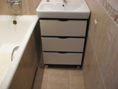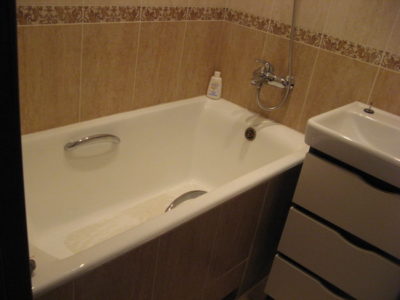 Наша компания выполнила ремонт в малогабаритной квартире, эргономично организовав пространство в ванной комнате и туалете. Для отделки поверхностей использовалась керамическая плитка нежно-розового и белого цвета. Придать нарядности удалось за счет горизонтальной укладки трех полос декоративной фрезы по всему периметру стен. Мы установили умывальник с тумбой на три ящика рядом с акриловой ванной, скрытой за защитным экраном. На глухую стену навешен душ с крупным распылителем, а справа от него смонтирован полотенцесушитель. Потолок оформлен пластиковыми панелями с точечными светильниками. Оба помещения выполнены в едином стилевом решении. Стоимость черновых материалов составила 32 тыс. 150 руб. Полная цена — 123900 рублей.