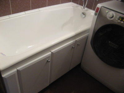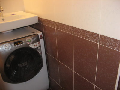 Наша компания выполнила ремонт ванной комнаты и туалета на улице Часовой. Для облицовки стен в обоих помещениях использовалась керамическая плитка белого и бордового цвета с мелким цветочным рисунком. В ванной комнате установлена акриловая ванна, полость под которой скрыта за распашными дверцами. Рядом расположена стиральная машина, а над ней смонтирован навесной умывальник. В туалете позади унитаза мы замаскировали инженерные коммуникации при помощи вертикальных жалюзи. Общая смета ремонта — 126000 рублей. Цена черновых материалов — 35 тыс. руб.