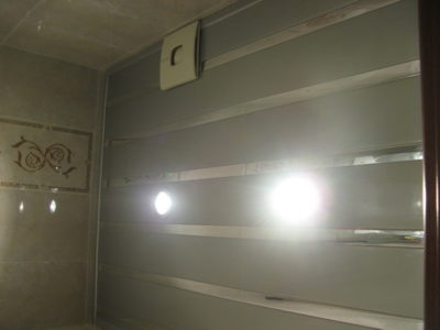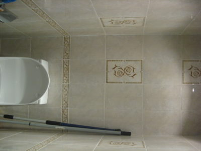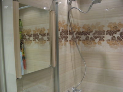 Наша компания выполнила ремонт ванной комнаты и туалета на улице Южнобутовская. Для отделки поверхностей был выбран кафель кремового цвета с деликатным фактурным рисунком. Вместо привычной фрезы мы выложили удлиненную мозаику с цветочным орнаментом на высоте человеческого роста. Потолок оформлен пластиковыми панелями с фольгированной лентой по краю.