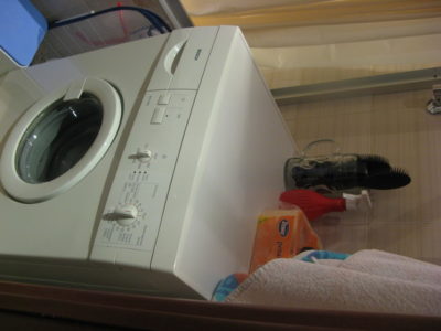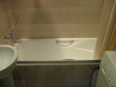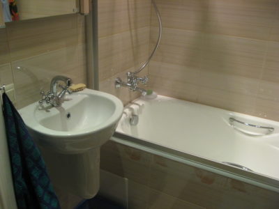 В ванной комнате установлены подвесная раковина, ванна с боковыми ручками и гибким душем, повешено зеркало на стену и смонтирован полотенцесушитель. На небольшой площади мы нашли место под стиральную машину.