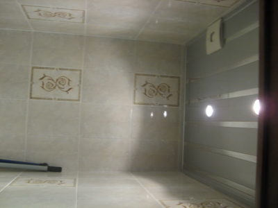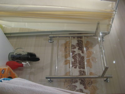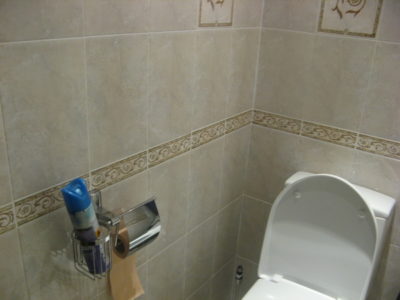 В туалете стены декорированы фрезой и плитами с золотым орнаментом. В помещении установлен новый унитаз. Общий бюджет составил 123000 рублей. Стоимость черновых материалов — 34 тыс. руб.