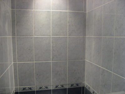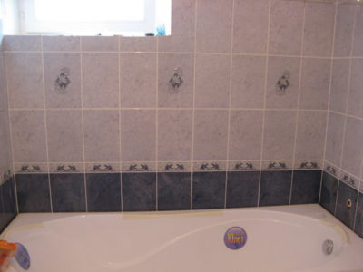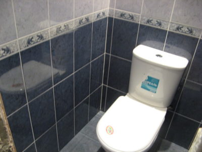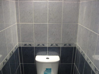 Наша компания выполнила капитальный ремонт раздельного санузла, выбрав для облицовки поверхностей в обоих помещениях плитку двух расцветок под мрамор (нежно-голубая и темно-синяя). В качестве разделителя использована декоративная фреза с цветочным орнаментом. В ванной комнате установлен полотенцесушитель, большая акриловая ванна с цельным защитным экраном и умывальник. В туалете старые трубы и унитаз заменены на современные аналоги. Для организации освещения в подвесной потолок вмонтированы точечные светильники.