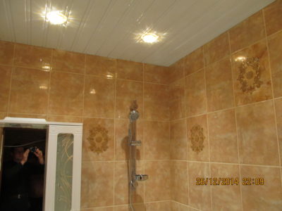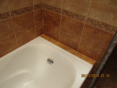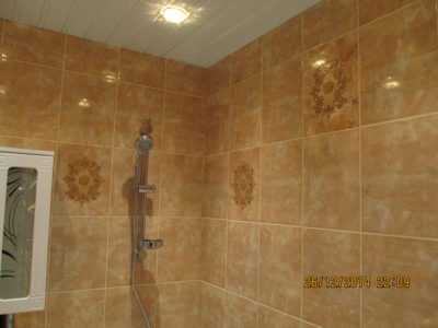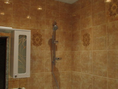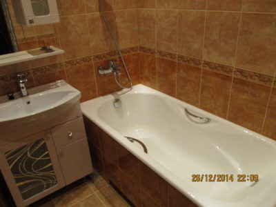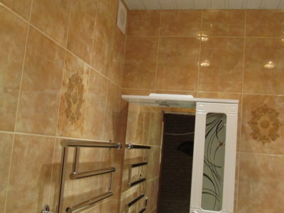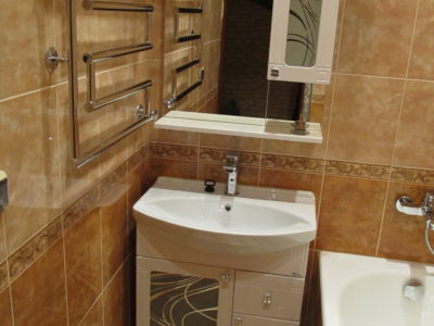 Мы выполнили капитальный ремонт ванной комнаты на Рязанском проспекте по утвержденному заказчиком дизайнерскому проекту. В малогабаритном помещении размерами 1,5х1,35 м мастера установили ванну с удобными ручками, держатель для душа, полотенцесушитель и умывальник с двухсекционной тумбой. Над раковиной мы повесили зеркало с боковым шкафчиком и вмонтировали в верхнюю полку точечный светильник. Для отделки поверхностей был выбран кафель светло-бежевого и кофейного тонов. В подвесной потолок встроено 4 светильника. Общая стоимость ремонта – 74000 руб. На черновые материалы ушло 25000 р.