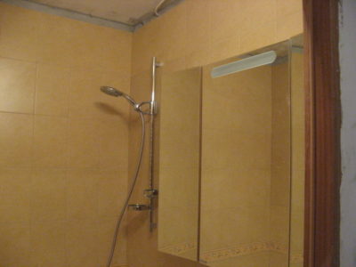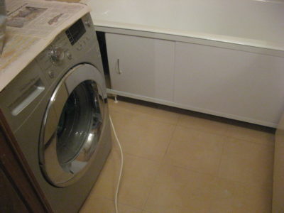 Наша компания выполнила бюджетный ремонт ванной комнаты в квартире старого жилого фонда на улице Новопесчаная. Потолок оформлен пластиковыми панелями со встроенными светильниками. Стены и полы облицованы однотонной керамической плиткой кремового цвета. Для обустройства душа в стену вмонтирована хромированная подставка. В комнате установили ванну, мойдодыр на три створки и стиральную машину. Над мойкой мы навесили зеркало по типу трюмо со складными ставнями. Стоимость ремонта составила 74 тыс. руб. На черновые материалы было затрачено 25000 р.